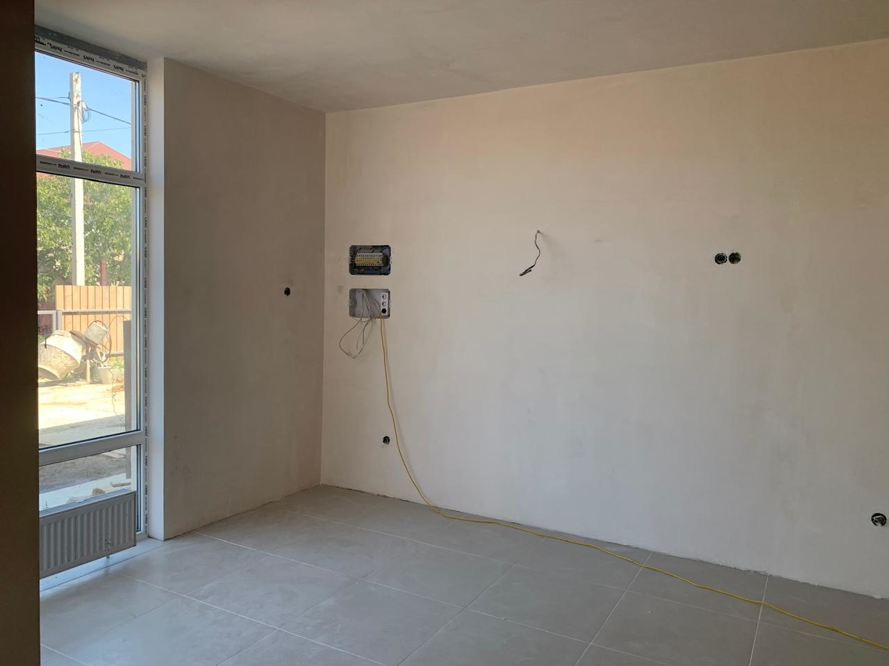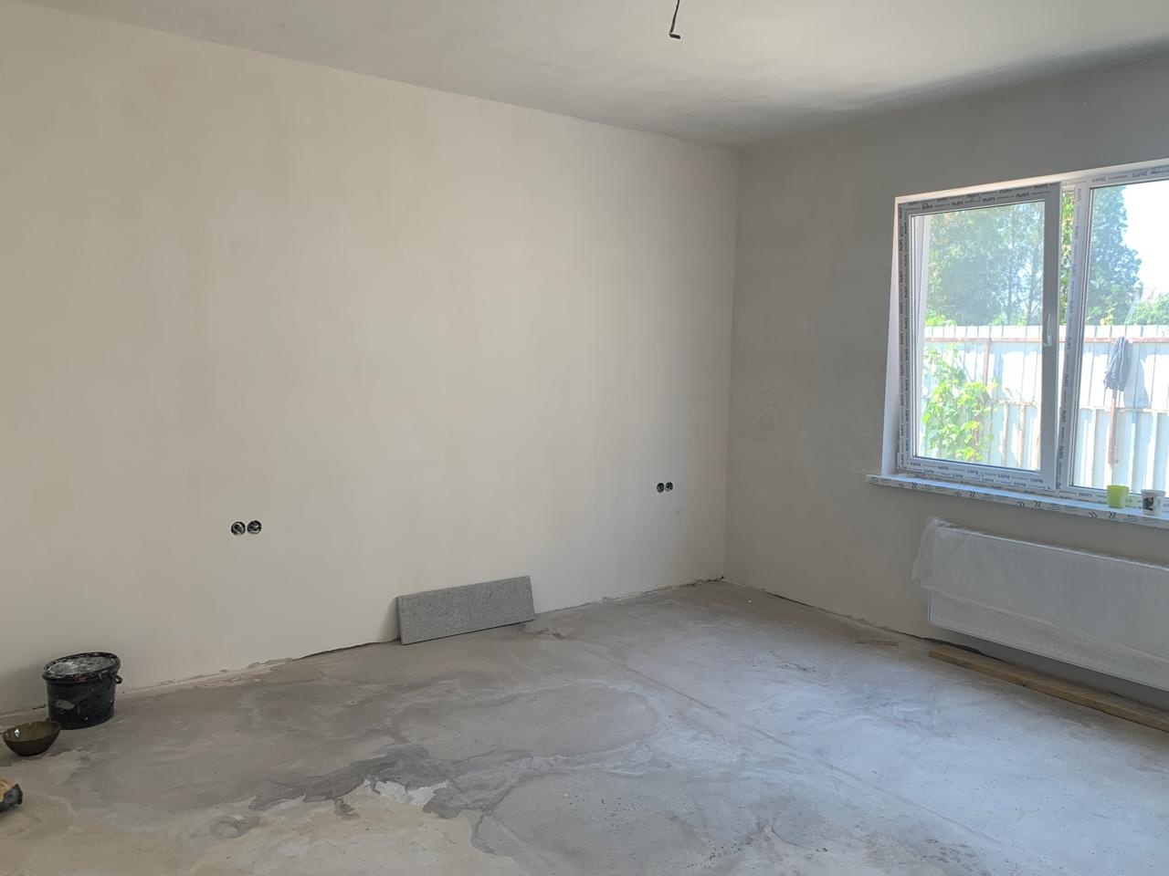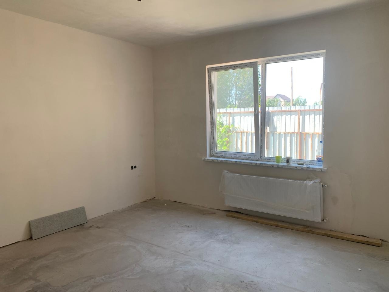 Дом в предчистовой отделке. На первом этаже просторный холл, кухня, комната, совмещ.санузел. На втором этаже совмещ.санузел и две спальни (одна с небольшим балконом).