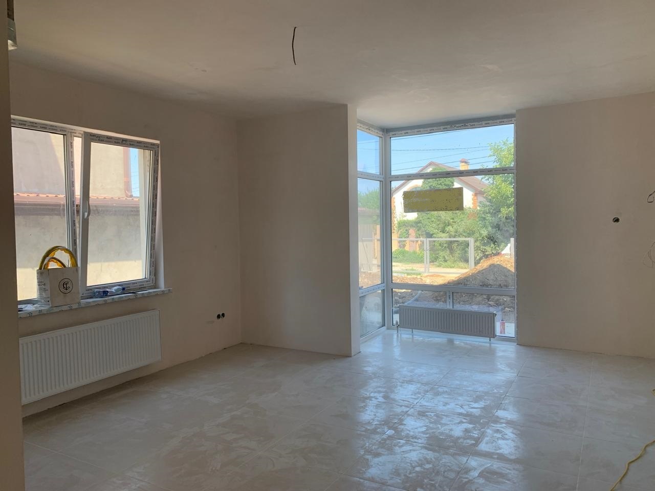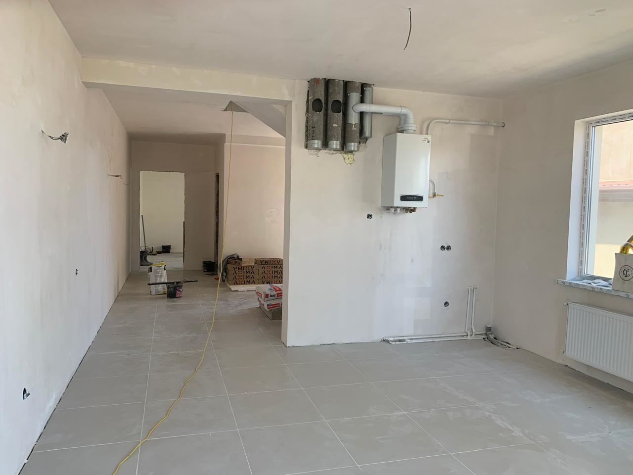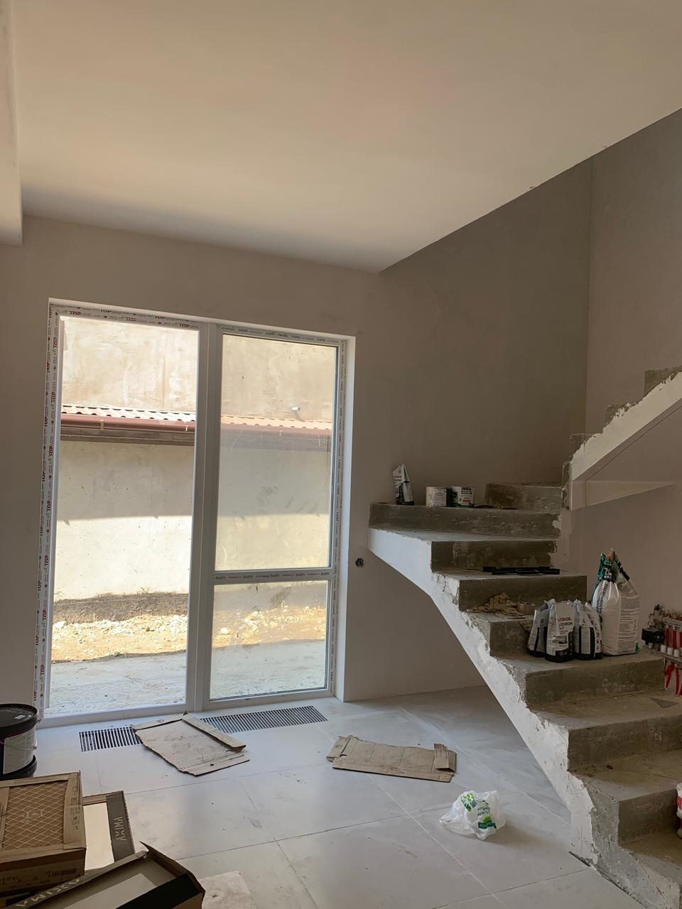 Дом в предчистовой отделке. На первом этаже просторный холл, кухня, комната, совмещ.санузел. На втором этаже совмещ.санузел и две спальни (одна с небольшим балконом).